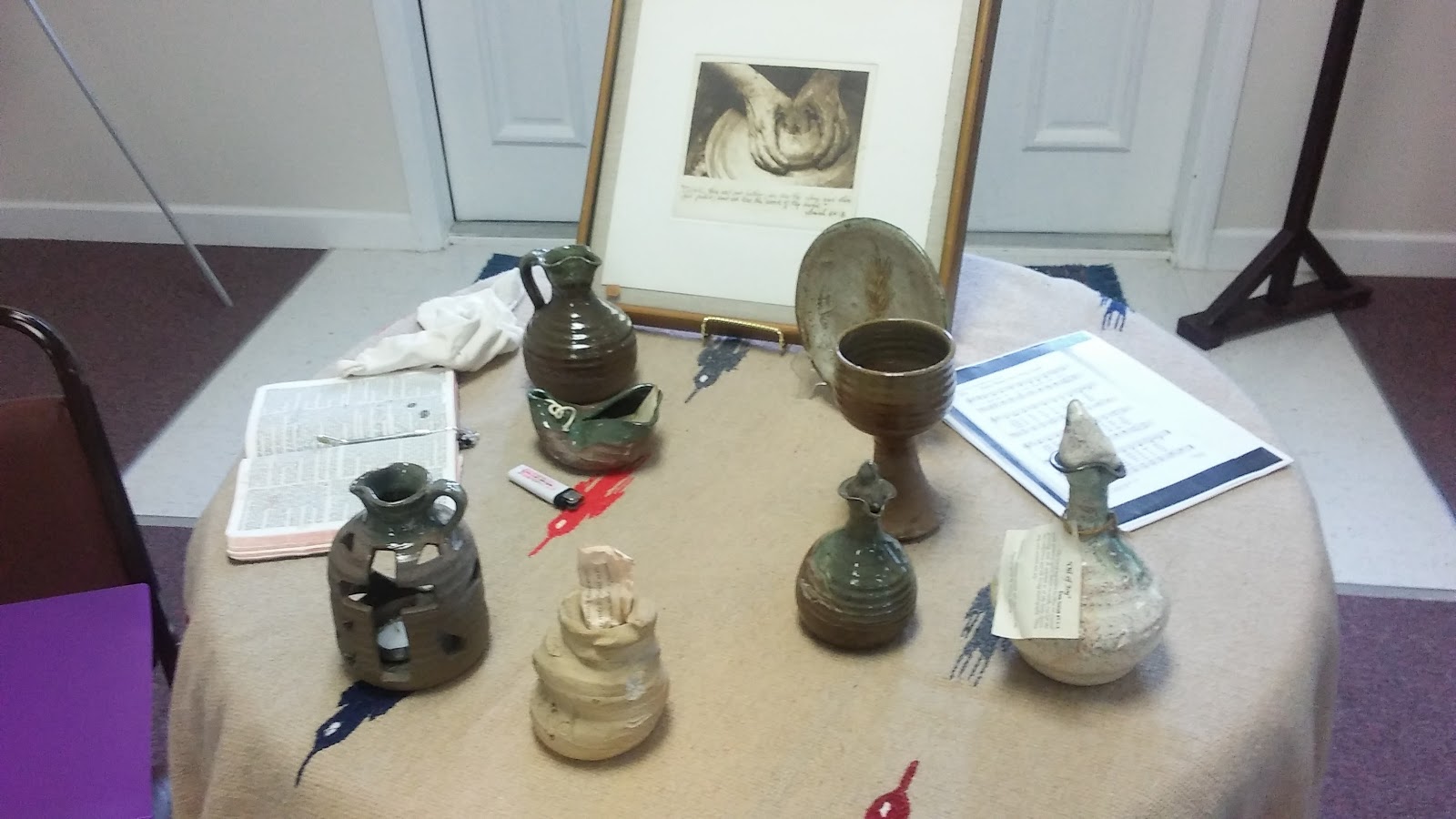 She also brought along various pieces of pottery that would have been typical in Biblical times. From left to right: Gideon's jar, two cruets for mixing oils, a chalice and plate, and in the back a short oil lamp similar to one the ten virgins might have held in Jesus's story.